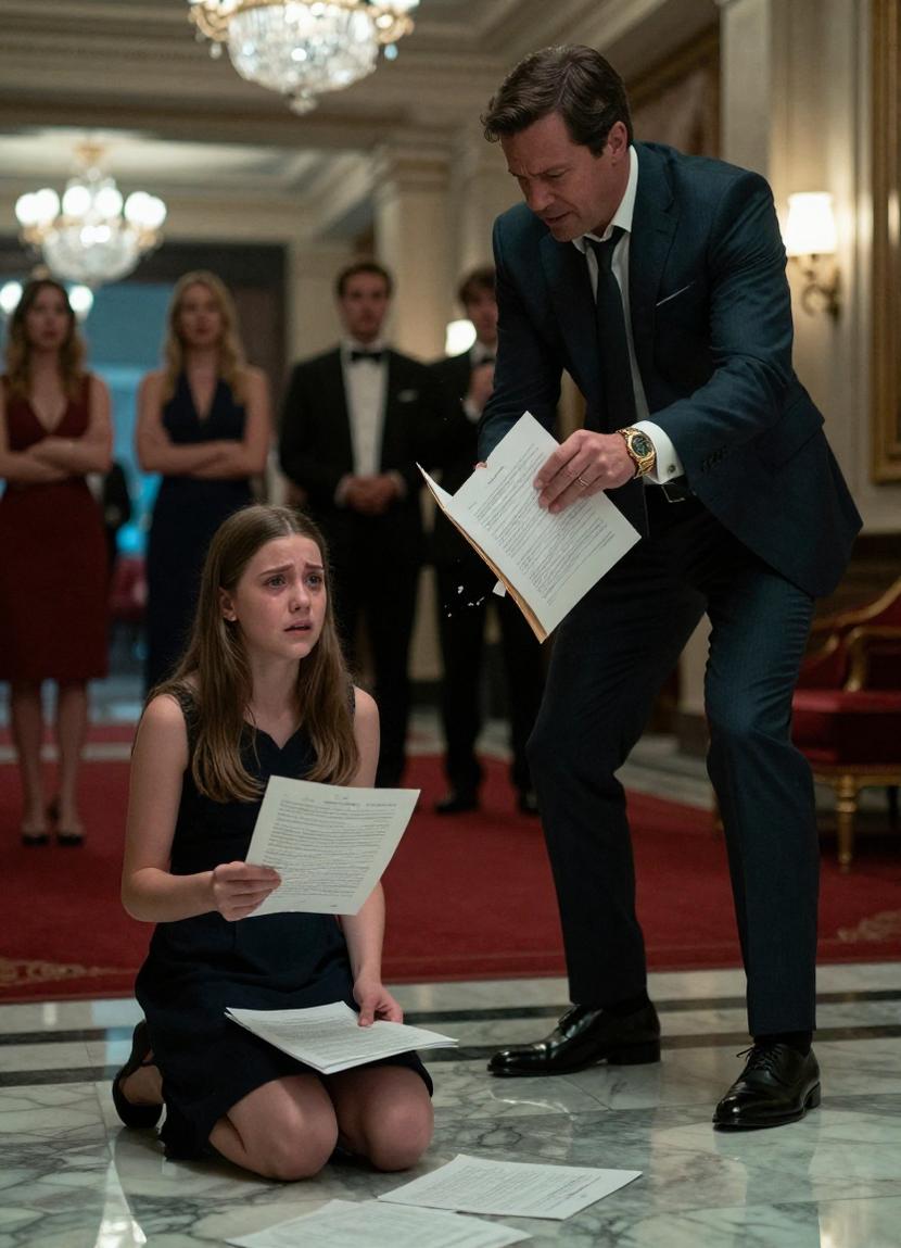 At exactly 7:00 p.m., The Sterling Regent in New York City dazzled like a fortress of light and luxury—red carpets unfurled under feet polished to shine, crystal chandeliers cast a glittering glow, and champagne flutes chimed in orchestral rhythm. Glamorous guests in gowns worth a fortune drifted through the gilded halls like myths come to life. And in the very heart of this shimmering spectacle stood a fragile twelve-year-old girl, clutching a battered folder, fingers trembling with a mix of fear and fierce determination.